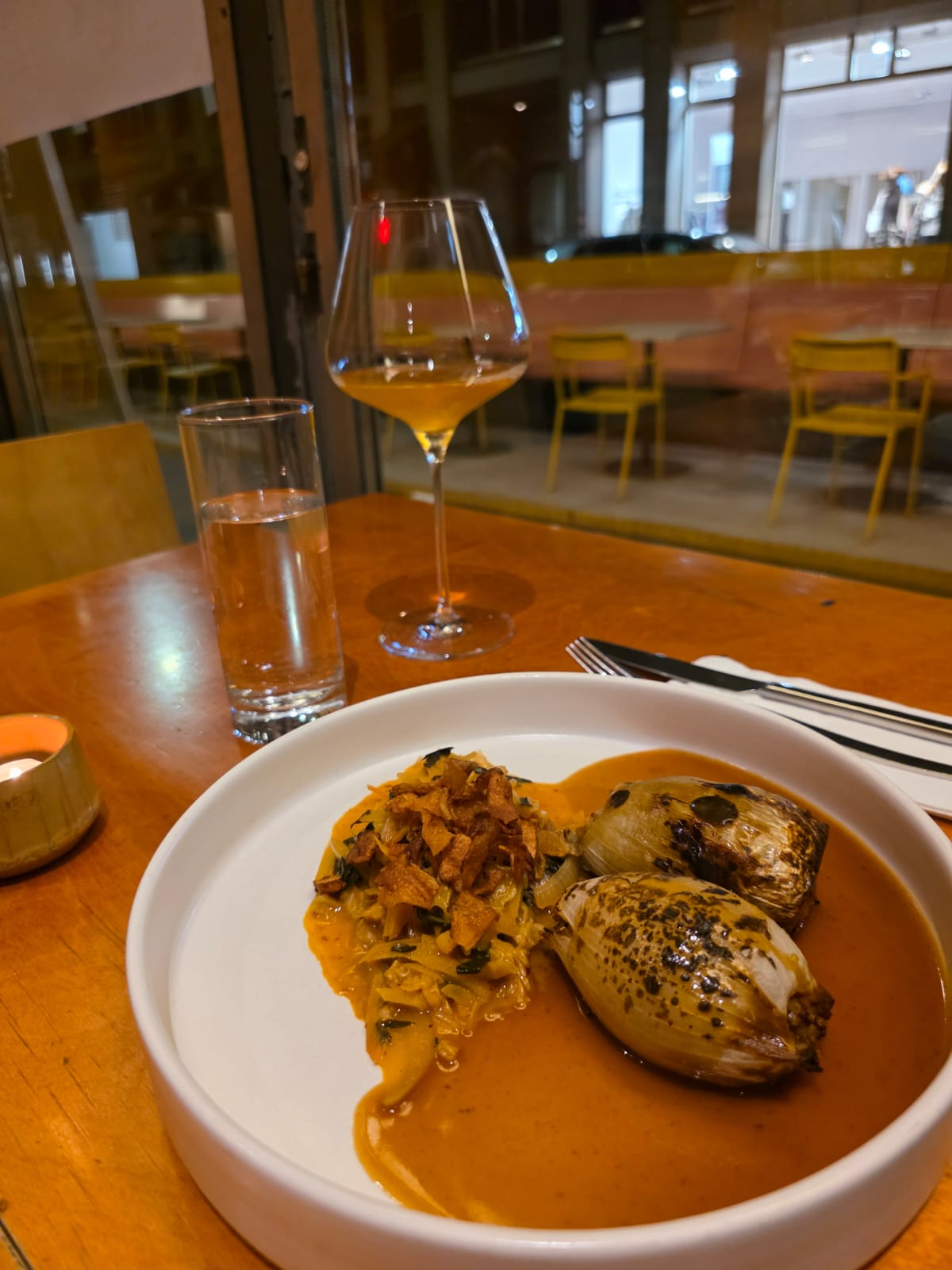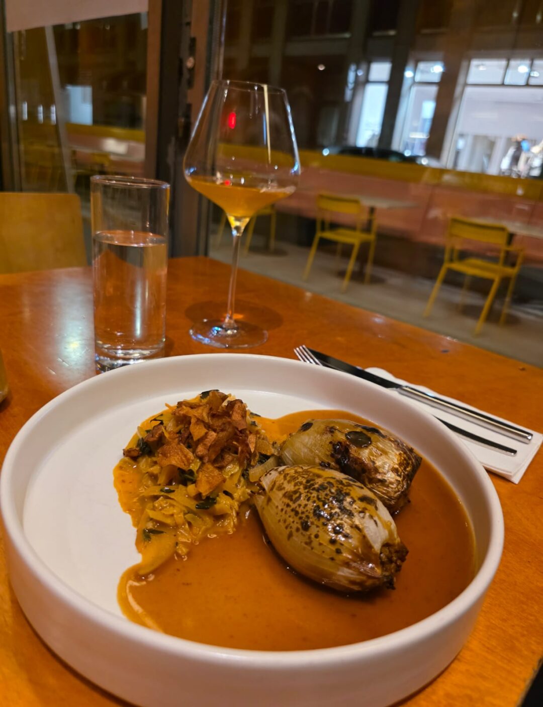 Beim 3. Gang, dem Hauptgang, wurde es dann etwas deftiger! Zwiebel, herzhaft gefüllt mit Bulgur samt leichter Säurenoten vom selbst fermentierten Grünkohl-Kimchi. Dazu wurde eine mollige Kaffee-Glace aus hauseigenem Jus gezaubert, während Topinambur Chips für den bei mir beliebten Crunch sorgen. Soviel ich weiß sind gefüllte Zwiebeln in Bosnien und Herzegowina gang und gebe! Eine spannende Erfahrung am Gaumen!