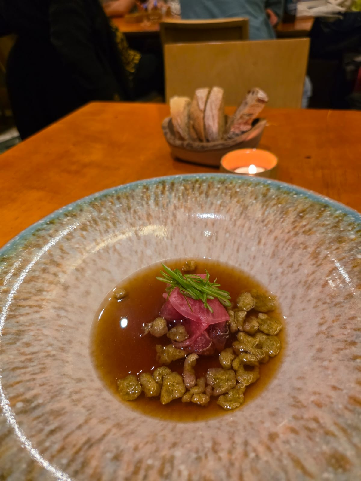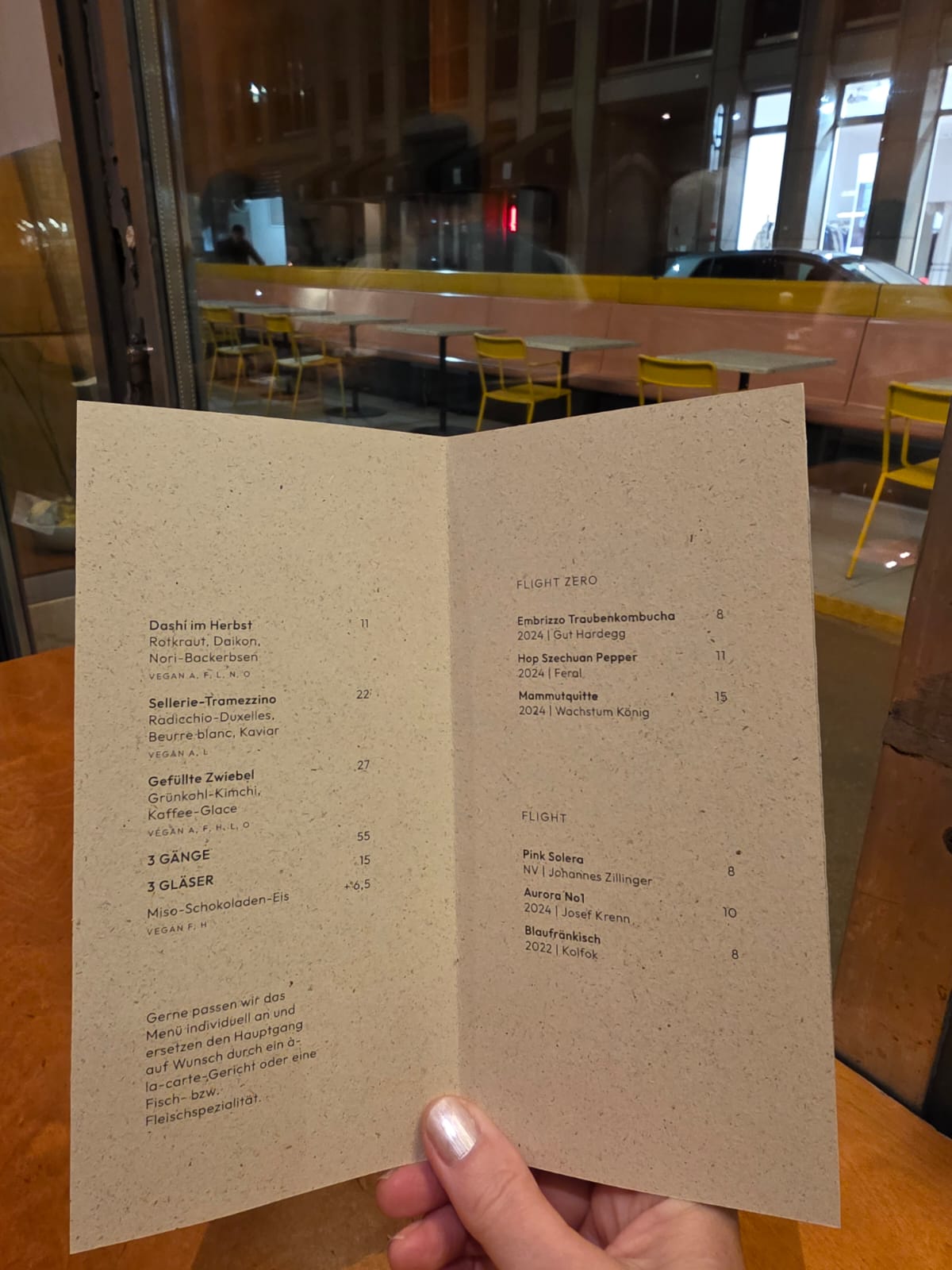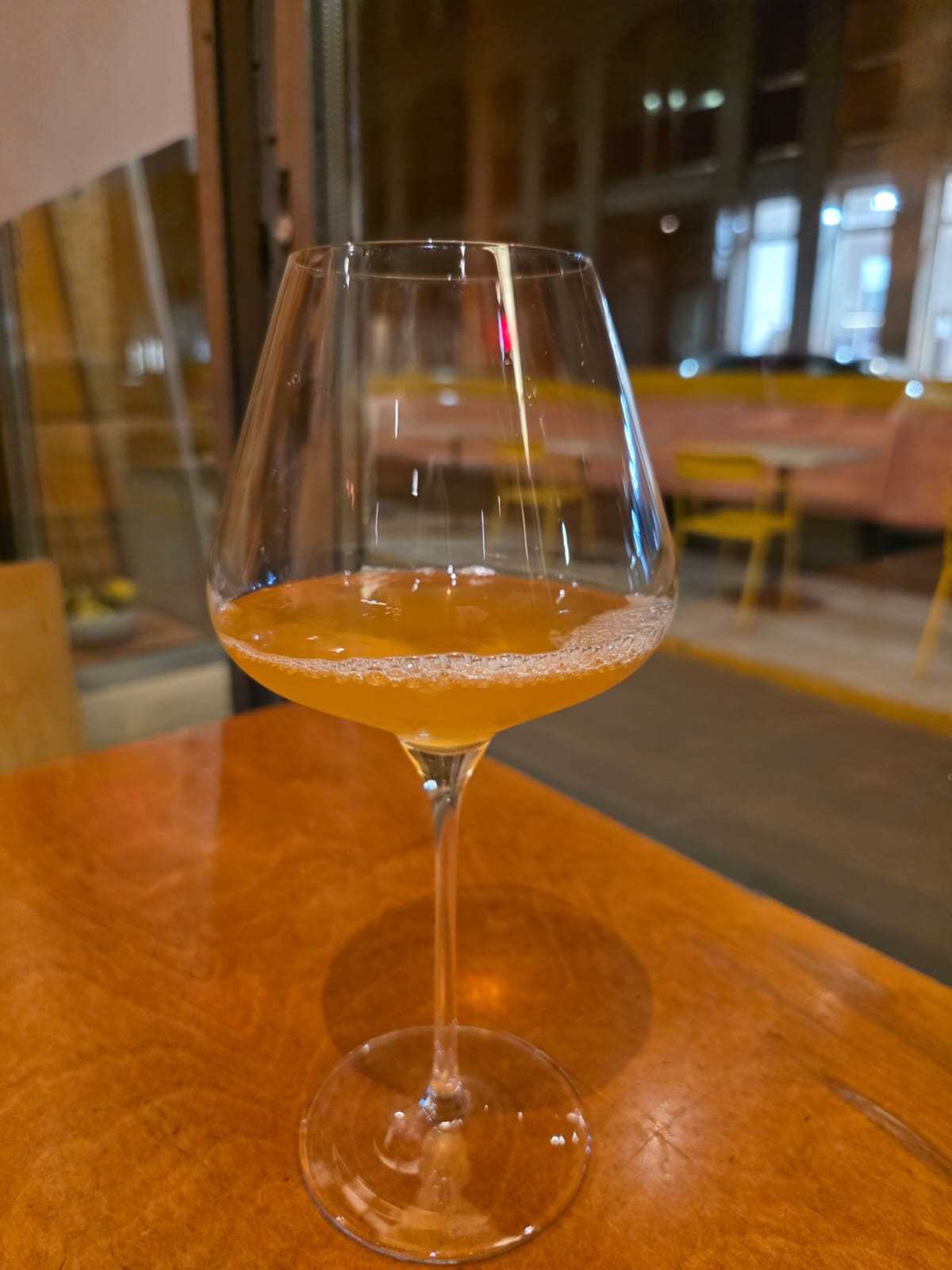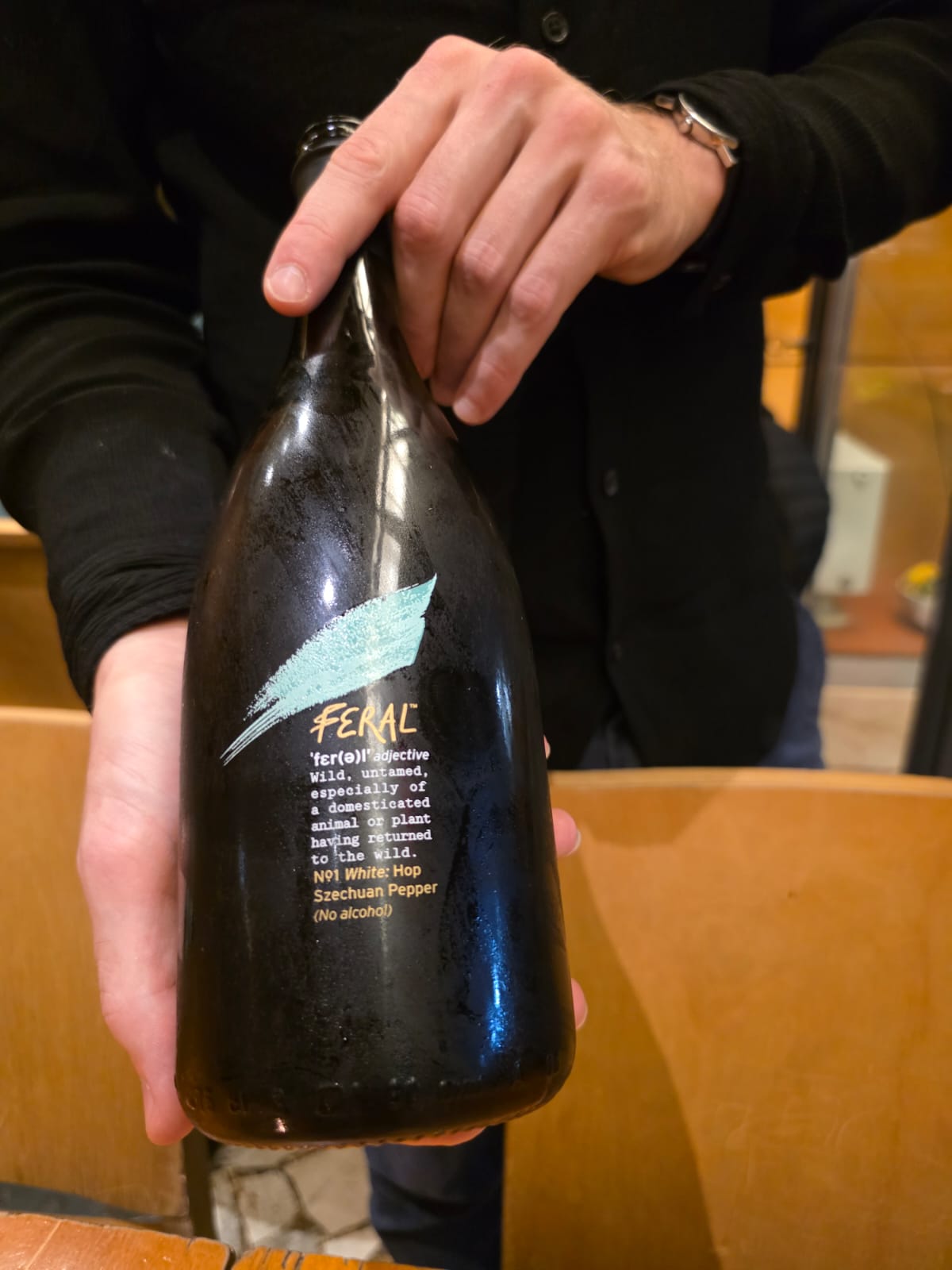 Bevor es zum 2. Gang geht, wird Flight Zero fortgesetzt: Oliver schenkt mir Hop Szechuan Pepper 2024 von Feral, einer italienischen Produktionsfirma aus dem Trentino, die sich auf fermentierte Getränke aus Rüben spezialisiert hat. Diese Spezialität aus weißen Rüben verfügt über einen besonderen Twist: Eine Fermentation, die mit Topfen und Szechuan verfeinert ist und im Abgang etwas Perlendes besitzt. Schön erfrischend mit angenehm herber und runder Note. Schon ein echtes Experiment!