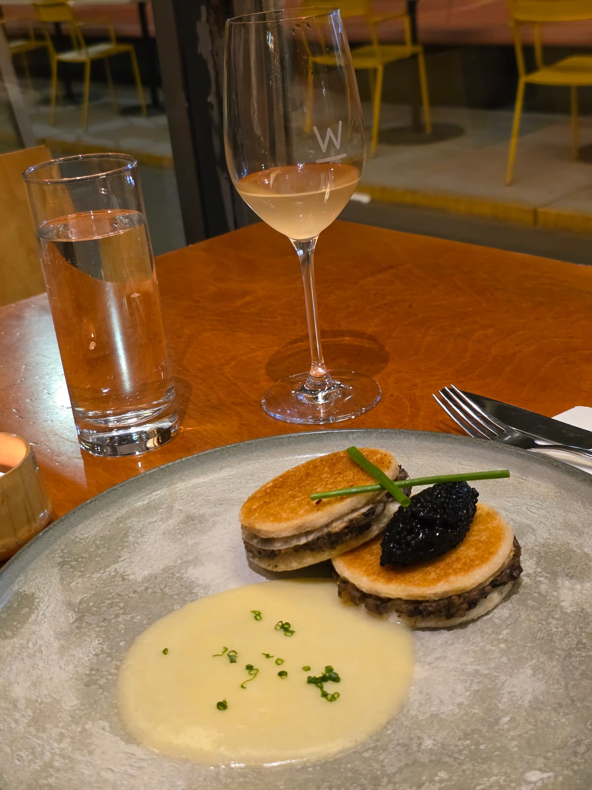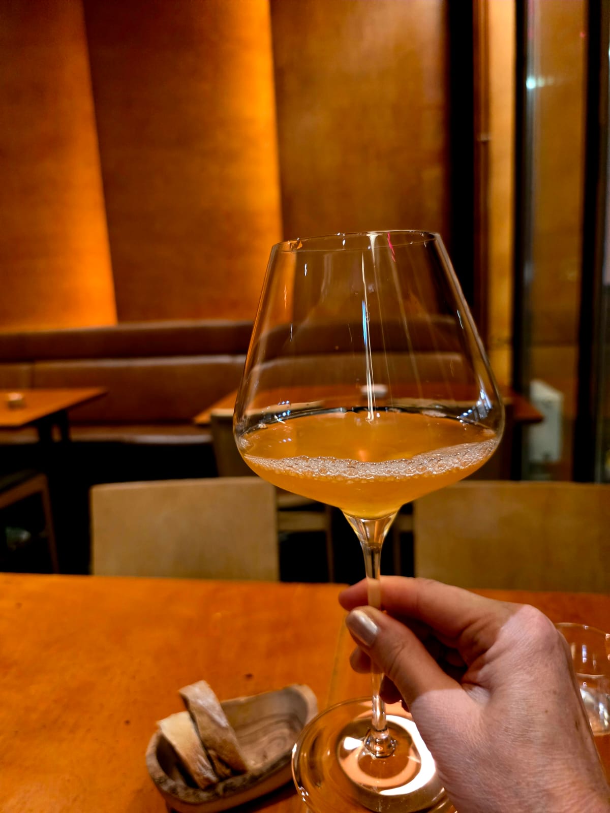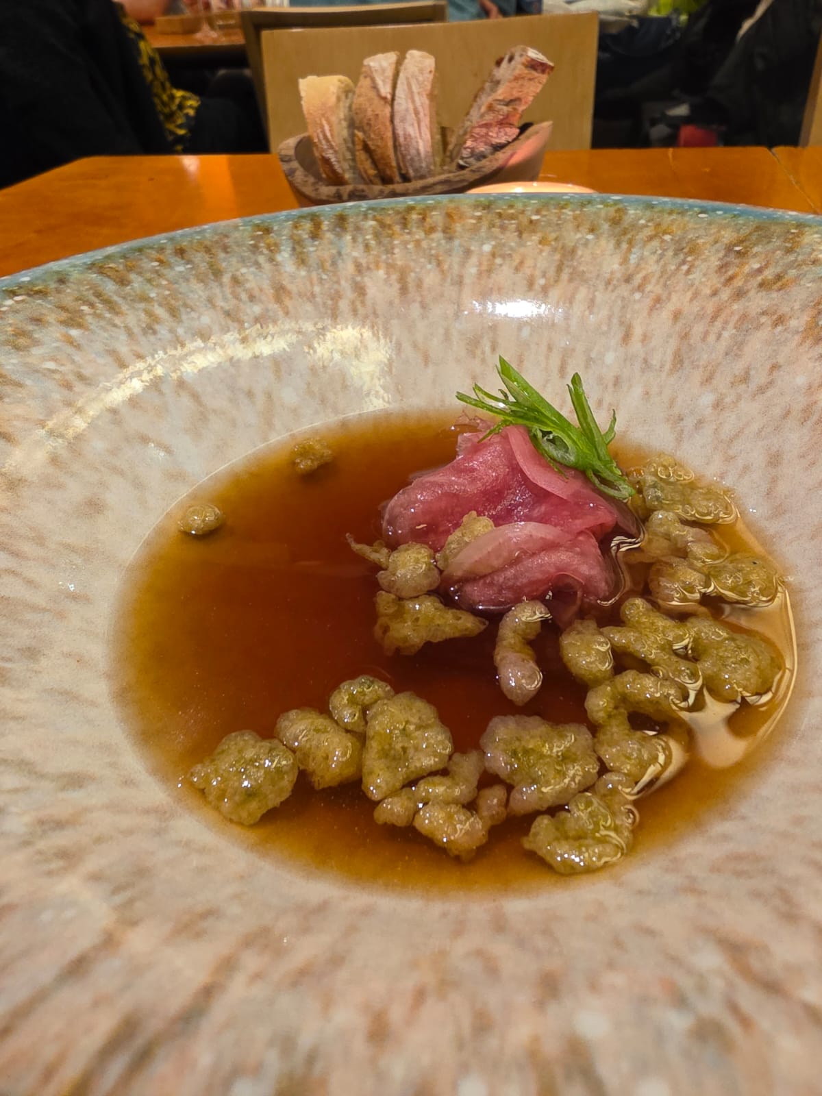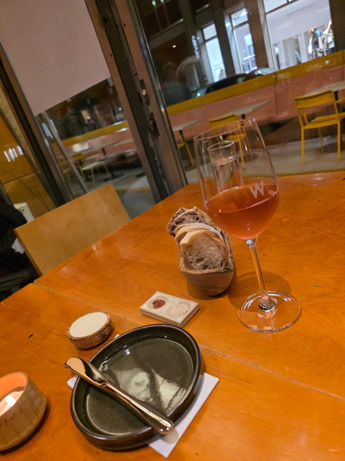 Bevor es zum 2. Gang geht, wird Flight Zero fortgesetzt: Oliver schenkt mir Hop Szechuan Pepper 2024 von Feral, einer italienischen Produktionsfirma aus dem Trentino, die sich auf fermentierte Getränke aus Rüben spezialisiert hat. Diese Spezialität aus weißen Rüben verfügt über einen besonderen Twist: Eine Fermentation, die mit Topfen und Szechuan verfeinert ist und im Abgang etwas Perlendes besitzt. Schön erfrischend mit angenehm herber und runder Note. Schon ein echtes Experiment!