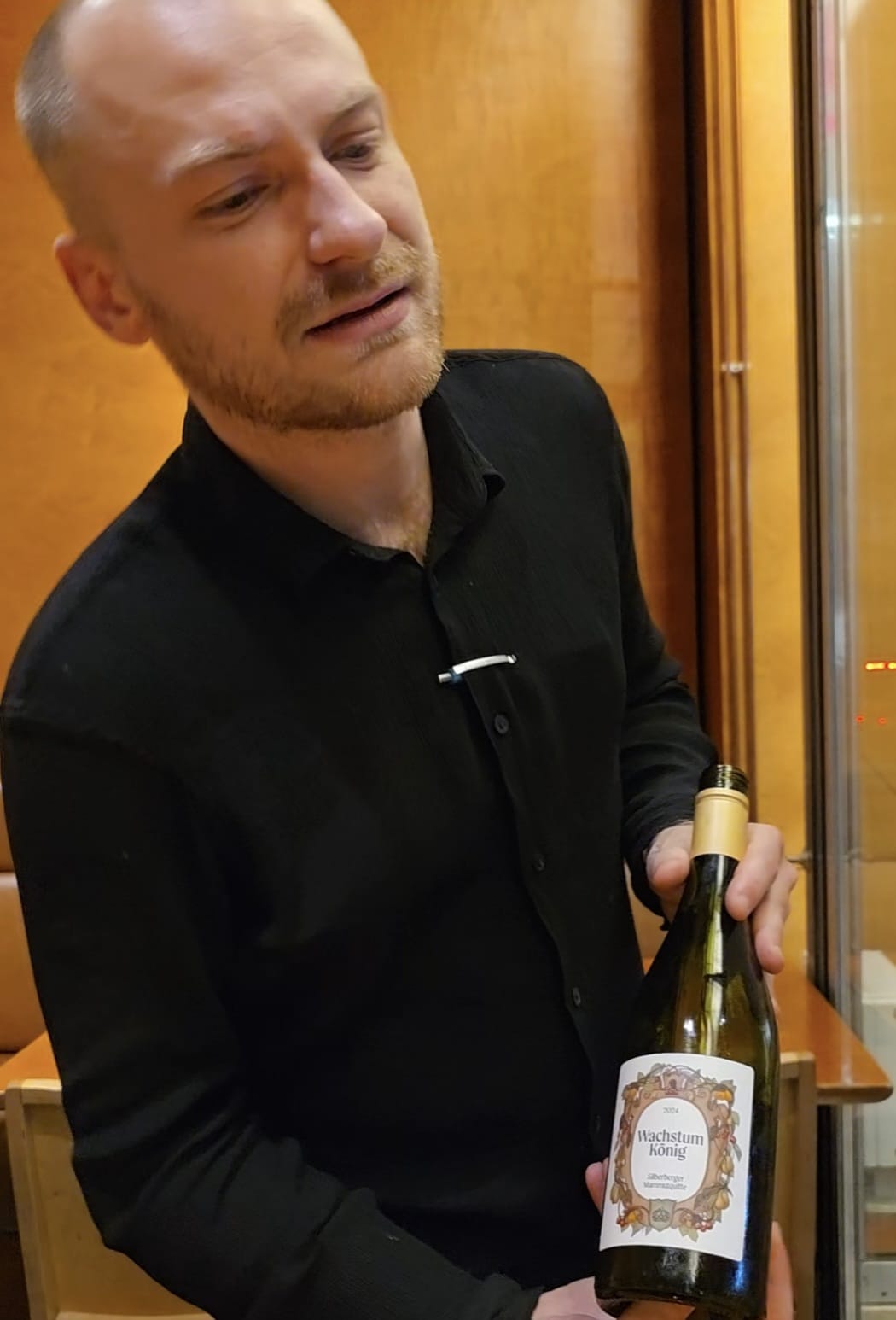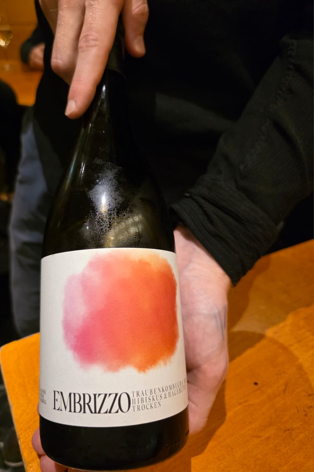 Oliver schenkt mir für einen perfekten Start in das 3-gängige Herbstmenü Embrizzo Traubenkombucha 2024 mit Hibiskus und Hagebutte vom Weingut Graf Hardegg ein. Ein extravagantes Getränk mit wunderschöner Farbe aus fermentiertem und entalkoholisierten Wein der Rebsorten Grüner Vetlliner und Zweigelt. Und wieder der Weinviertelbezug: Das Familienweingut Graf Hardegg ist in Seefeld im Weinviertel zu Hause und überrascht mit diesem sehr trockenen, alkoholfreien Speisenbegleiter.