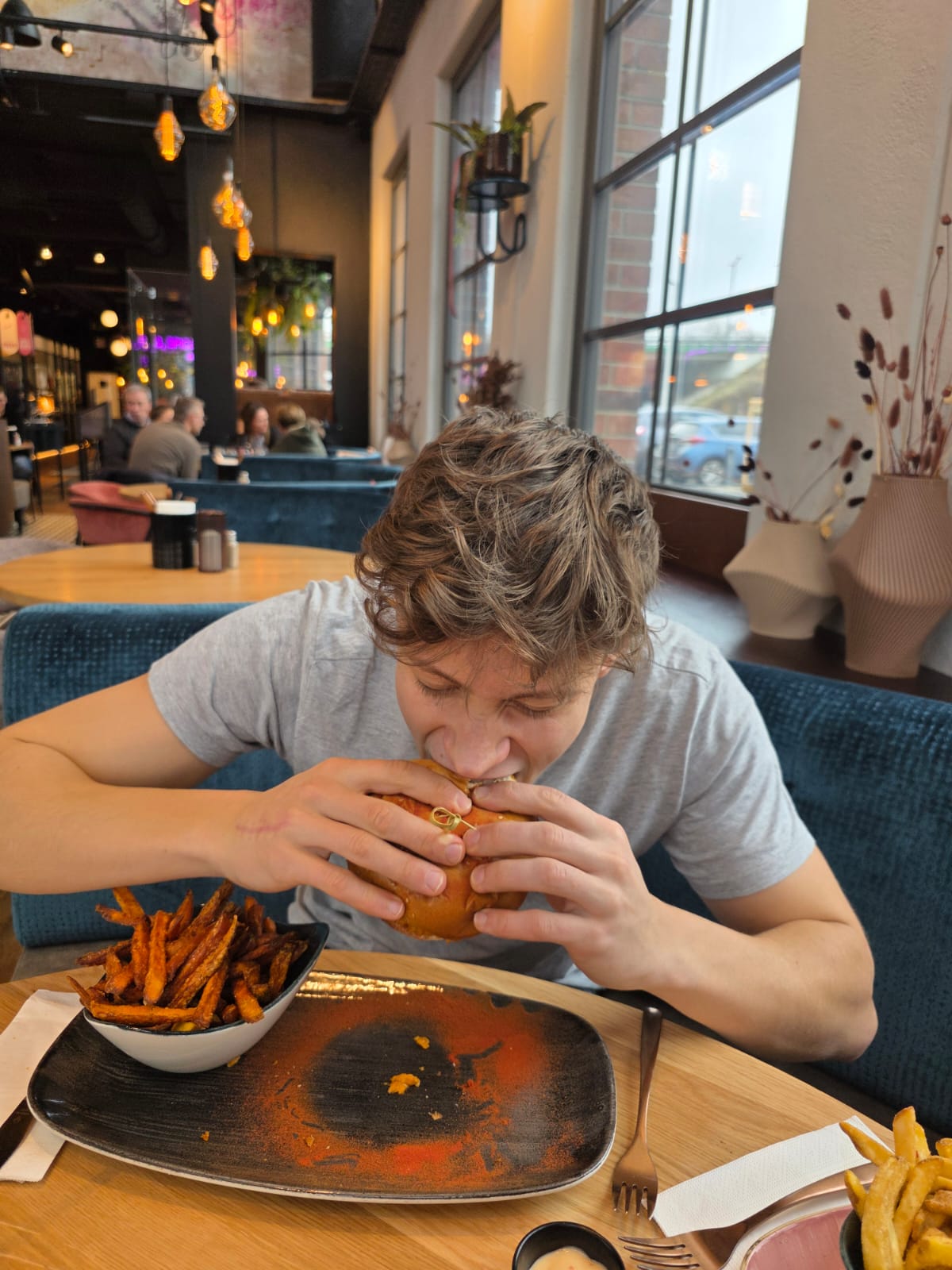 Nachdem das junge Paar die zeitgemäße Innenarchitektur, die Pflanzenwände, das großzügige Raumangebot und die einladenden Sitzmöglichkeiten mit Pepp genügend bewundert hatten, ging es auch schon zum genussvollen Teil: Wir wählten das neue Special Bob’s Future Burger, bei dem das Burgerpatty aus 80 Prozent Rindfleisch und 20 Prozent Sonnenblumengranulat besteht sowohl mit Süßkartoffelpommes als auch mit klassischen Fries.